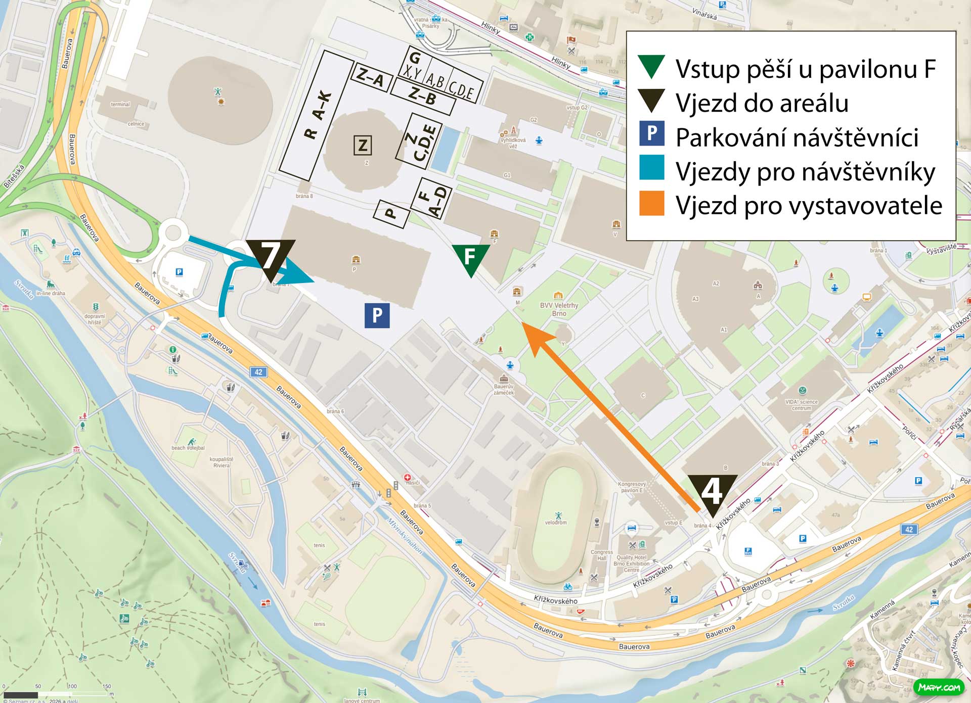 Upozorňujeme všechny návštěvníky, že vjezd je pouze branou číslo 7, tj brána od nové rozestavěné multifunkční haly za pavilonem P. Také parkování bude v okolí pavilonu P.